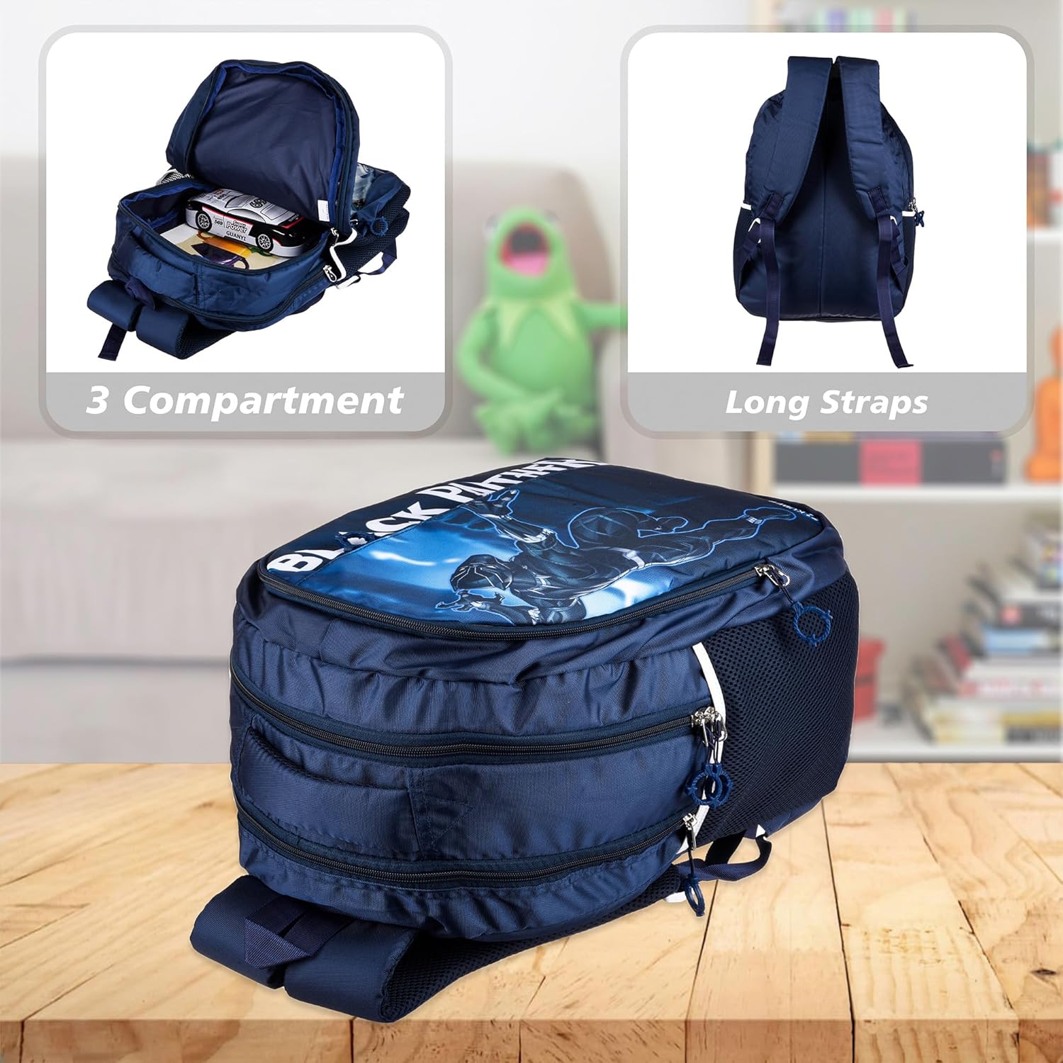 🔰 PACKAGE CONTAIN : 1 Piece School Bag | Marvel Black Panther-Blue with Cover | 5 Compartment | MATERIAL : Nylon | PACKAGE DIMENSION : 45 cm x 30 cm x 24 cm